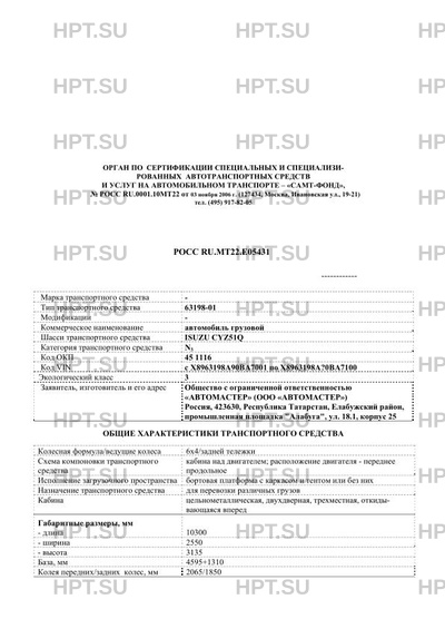 | Предприятие-изготовитель | Общество с ограниченной ответственностью "АВТОМАСТЕР" (ООО "АВТОМАСТЕР"). Россия, 423630, Республика Татарстан, Елабужский район, СЭЗ "Алабуга", ул. 18.1 |