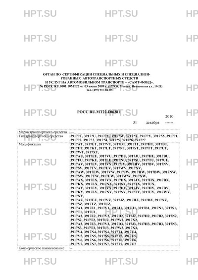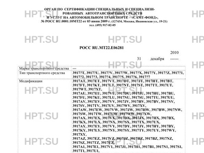 | Оборудование ТС | 3917A? - автономный отопитель, стол откидной, дезинфекционная камера, топливный бак (либо баллон), трубопровод, насос ручной, котёл паровой, труба дымовая, огнетушитель, ящик укладочный, бак питательный, гидропульт, комплект ЗИП на установку, переднее ограждение для защиты облицовки и фар, проблесковый маячок желтого цвета спереди и два сзади, лестница с правой стороны сзади фургона для подъема на крышу, багажник на крыше фургона, три технологических лючка в крыше фургона; 3917E? - дезинфекционная камера, топливный бак (либо баллон), трубопровод, насос ручной, котёл паровой, труба дымовая, огнетушитель, ящик укладочный, бак питательный, прибор душевой, электростанция переносная бензиновая на 0,5 кВт, цистерна вместимостью 1300 дм3, комплект ЗИП на установку, переднее ограждение для защиты облицовки и фар, проблесковый маячок желтого цвета спереди и два сзади, лестница с правой стороны сзади фургона для подъема на крышу, багажник на крыше фургона; 3917V? - дезинфекционная камера, топливный бак (либо баллон), трубопровод, насос ручной, котёл паровой, труба дымовая, огнетушитель, ящик укладочный, бак питательный, гидропульт, комплект ЗИП на установку; 3917D? - водяной насос низкого давления или паровой котел с трубопроводной системой, водяной насос высокого давления, масляная силовая гидросистема, бак дезинфекционного раствора, пистолеты и распылители водяные, световая панель или маячок желтого цвета на крыше кабины; 3917J? - предпусковой подогреватель 5 кВт, электромеханическая лебедка 20 м. + чалка 20м, доп. топливный бак (для а/м с диз. двиг.), фара-искатель (наружный, со стороны водителя), противотуманные фары, кондиционер (хладагент R-134a), спереди крепление для телескопической антенны, сзади лестница для подъема на крышу, багажник; 3917H? - наполнение колес полиуретаном, проблесковые маячки желтого цвета (при транспортировке ГСМ), лестница сзади фургона для подъема на крышу; 3917B? - котёл паровой, топливный бак (либо баллон), трубопровод, насос ручной, труба дымовая, огнетушитель, ящик укладочный, бак питательный, рукав паровой обработки, цистерна вместимостью 1300 дм3, комплект ЗИП на установку, переднее ограждение для защиты облицовки и фар, лестница с правой стороны сзади фургона для подъема на крышу, багажник на крыше фургона; 3917F?, 3917K?, 3917L? - проблесковый маячок или световая панель желтого цвета; 3917N? - система автономного отопления и вентиляции, система блокировки замков в/в отсека, усиленное освещение, боковое окно двойного остекления, трап, покрытый износостойким линолеумом, багажник на крыше с креплением для съемной лестницы, сзади или сбоку лестница для подъема на крышу; 3917S?, 3917T? - аварийно-спасательное оборудование и инструмент, багажник на крыше с креплением для съемной лестницы, сзади или сбоку лестница для подъема на крышу; 3917S? - СГУ или проблесковый маячок синего цвета спереди и два сзади на фургоне (для авт. оперативных служб) или желтого цвета (для авт. дорожных служб); 3917U? - стеллажи, полки, верстаки, инструмент, багажник на крыше с креплением для съемной лестницы, сзади или сбоку лестница для подъема на крышу 10 |
