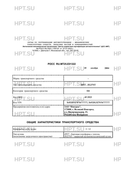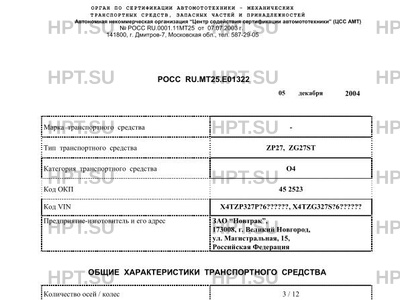Предприятие-изготовитель ЗАО "Новтрак", 173008, г. Великий Новгород, ул. Магистральная, 15, Российская Федерация