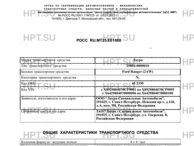 | Базовое ТС / Шасси | Ford Ranger (2AW) |
