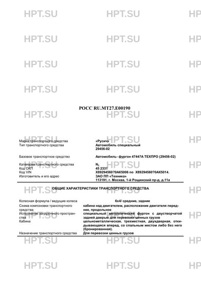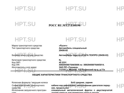 | Коммерческое наименование | Автомобиль специальный 29456-02 на базе автомобиль- фургон 47447А ТЕХПРО (29456-02) КамАЗ-53215 |
