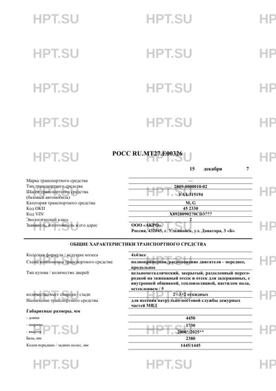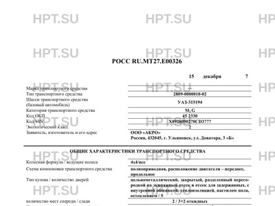 | Базовое ТС / Шасси | (базовый автомобиль) УАЗ-315194 |