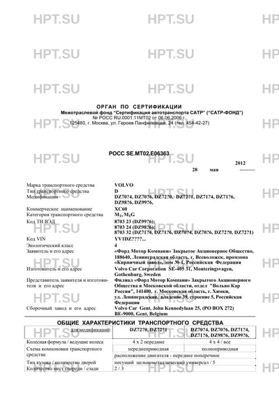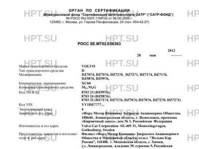 | Предприятие-изготовитель | Volvo Car Corporation SE-405 31, Monteringsvagen, Gothenburg, Sweden Представитель заявителя и изготовителя и его адрес Филиал "Форд Мотор Компани" Закрытого Акционерного Общества в Московской области, отдел "Вольво Кар Россия", 141400, г. Московская область, г. Химки, ул. Ленинградская, владение 39, строение 5, Российская Федерация |