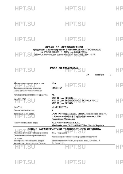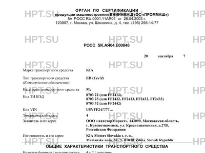 | Предприятие-изготовитель | KIA Motors Slovakia s. r. o., Marianske nam. 30 / 5, 010 01 Zilina, Slovak Republic |