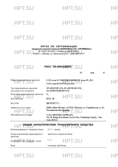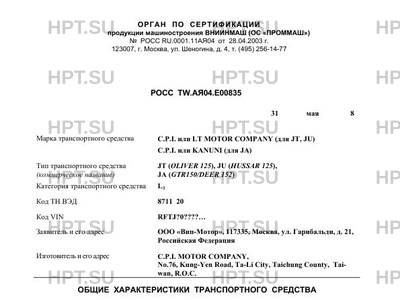 Марка ТС С.P.I. или LT MOTOR COMPANY (для JT, JU) С.P.I. или KANUNI (для JA)