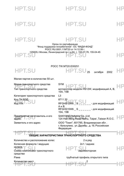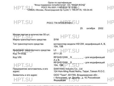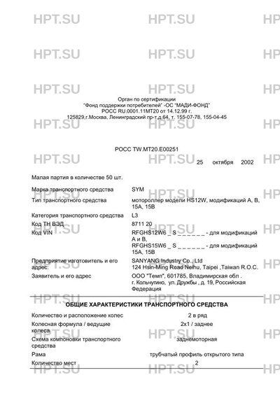 | Тип ТС | мотороллер модели HS12W, модификаций А, В, 15А, 15В |