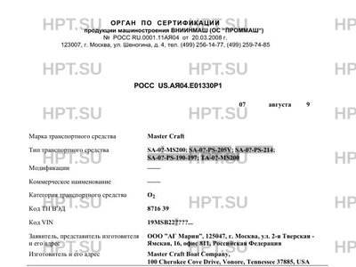 | Предприятие-изготовитель | Master Craft Boat Company, 100 Cherokee Cove Drive, Vonore, Tennessee 37885, USA |