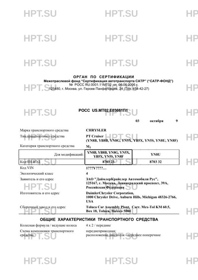 | Предприятие-изготовитель | DaimlerChrysler Corporation, 1000 Chrysler Drive, Auburn Hills, Michigan 48326-2766, USA |