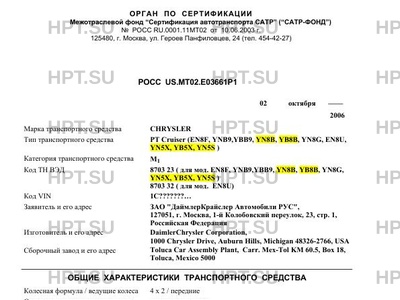 | Предприятие-изготовитель | DaimlerChrysler Corporation, 1000 Chrysler Drive, Auburn Hills, Michigan 48326-2766, USA |
