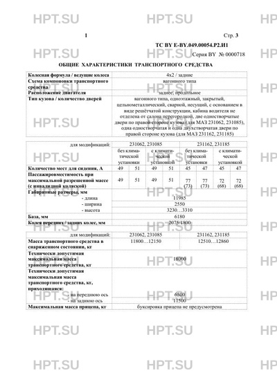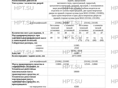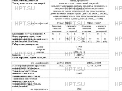 Категория ТС M3 (автобус, класс II для модификаций 231162, 231185; класс III для модификаци…