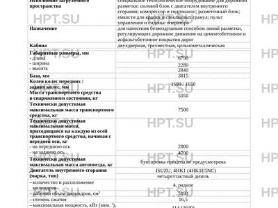 | Оборудование ТС | технологическое оборудование для нанесения дорожной разметки расположено в тентовом кузове транспортного средства 1. Силовой блок в составе 1.1. Приводной двигатель KUBOTA D1105 T-E3B (Германия) - номинальный крутящий момент, Н·м 46 - мощность, кВт 16,2 |