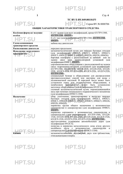 | Назначение | сбор, уплотнение, транспортировка и выгрузка твердых бытовых отходов (для модификаций: 6902С3, 6903С3, 6904С3, 690GC3, 6902C5, 6903C5, 6904C5, 690GC5, 690226, 690326, 690426); перевозка грузов общего назначения с возможностью самопогрузки и саморазгрузки (для модификации 6940С5, 6943F9); перевозка сортимента с возможностью самопогрузки и саморазгрузки (для модификаций: 6317F9-1560, 631228- 1526, 631228-1528, 631228-2526, 631228-2528, 6312С9-1526, 6312С9-1528, 6312С9-2526, 6312С9-2528, 6317F9-1544); круглогодичное содержание автомобильных дорог (для |