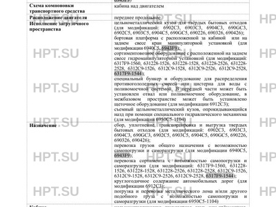 | Исполнение загрузочного пространства | цельнометаллический кузов для твёрдых бытовых отходов (для модификаций: 6902С3, 6903С3, 6904С3, 690GC3, 6902C5, 6903C5, 6904C5, 690GC5, 690226, 690326, 690426); бортовая платформа с расположенной за кабиной или на заднем свесе кран манипуляторной установкой (для |
