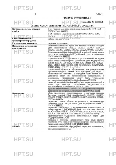 | Назначение | сбор, уплотнение, транспортировка и выгрузка твердых бытовых отходов (для модификаций: 6902С3, 6903С3, 6904С3, 690GC3, 6902C5, 6903C5, 6904C5, 690GC5, 690226, 690326, 690426); перевозка грузов общего назначения с возможностью самопогрузки и саморазгрузки (для модификации 6940С5, 6943F9, 6940С9); перевозка сортимента с возможностью самопогрузки и саморазгрузки (для модификаций: 6317F9-1560, 631228- 1526, 631228-1528, 631228-2526, 631228-2528, 6312С9-1526, 6312С9-1528, 6312С9-2526, 6312С9-2528, 6317F9-1544); круглогодичное содержание автомобильных дорог (для |