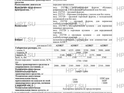 | Назначение | мод. 232700 с изотермическим кузовом - для перевозки пищевых продуктов; мод. 232720 с торговым кузовом - для передвижной торговли; мод. 232730 с грузовым кузовом - для перевозки хлебобулочных изделий |