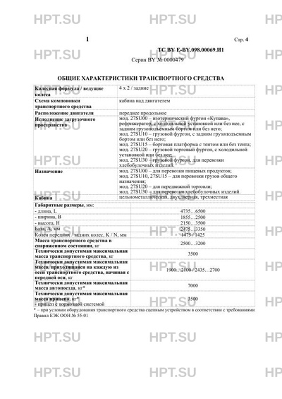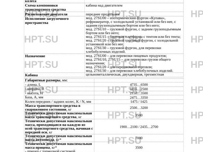 | Оборудование ТС | система контроля устойчивости - для шасси с двиг. ISUZU 4JJ1 (4JJ1E5LD) по заказу: подушки безопасности водителя и пассажира, ремни безопасности с преднатяжителями, кондиционер, электростеклоподъемники, наружные зеркала заднего вида с обогревом и/или электроприводом, центральный замок, заднее стекло в кабине, иммобилайзер, предпусковой подогревательотопитель, ограничитель скорости, тахограф, внутреннее зеркало, дневные ходовые огни, устройство вызова экстренных оперативных служб, автономный отопитель, для мод. 27SU00, 27SU20 - холодильная установка, для мод. 27SU00, 27SU10 - задний грузоподъемный борт |