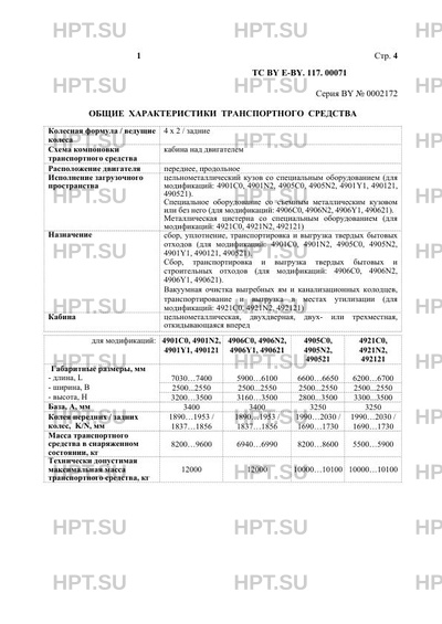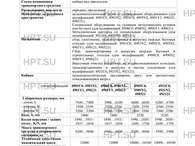 | Назначение | сбор, уплотнение, транспортировка и выгрузка твердых бытовых отходов (для модификаций: 4901С0, 4901N2, 4905С0, 4905N2, 4901Y1, 490121, 490521). Сбор, транспортировка и выгрузка твердых бытовых и строительных отходов (для модификаций: 4906С0, 4906N2, 4906Y1, 490621). Вакуумная очистка выгребных ям и канализационных колодцев, транспортирование и выгрузка в местах утилизации (для модификаций: 4921С0, 4921N2, 492121) |