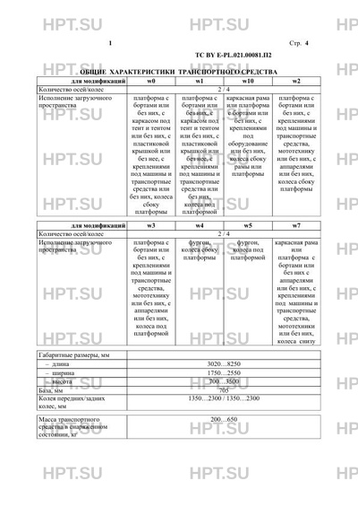 | Оборудование ТС | каркас тента, тент, борта, кронштейн запасного колеса, запасное колесо, опорное колесо, лебёдка, въездные подпоры, крепление для перевозки различных грузов, аппарели (в зависимости от |