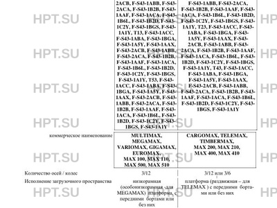 | Оборудование ТС | постоянно или по заказу - противооткатные башмаки, уширители, упоры, стойки, фиксаторы, кольца, кронштейны, трапы с пружинным или гидроприводом (MULTIMAX, MEGAMAX, MAX 100, MAX 110), гусь с гидросистемой установки (MEGAMAX), насосная станция с гидросистемой или без них, борта в передней части платформы или без них , запасное колесо или без него, лебедка или без нее, платформа с телескопированием или без нее, съемные борта или без них, управляемые или самоустанавливающиеся колеса(оси) или без них(МАХ ?00- с фиксированными и(или) самоустанавливающимися осями, МАХ ?10- с фиксированными и(или) управляемыми осями, остальные - с фиксированными и(или) самоустанавливающимися и(или) управляемыми осями), система принудительного поворота колес(осей) или без нее |