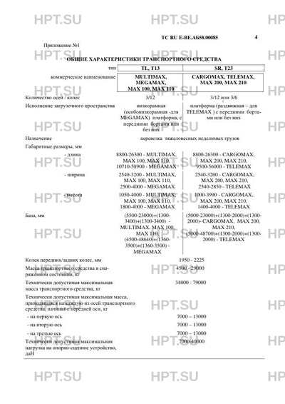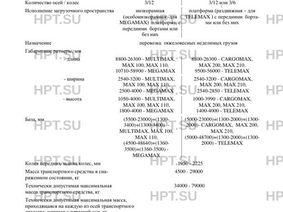 | Оборудование ТС | постоянно или по заказу - противооткатные башмаки, уширители, упоры, стойки, фиксаторы, кольца, кронштейны, трапы с пружинным или гидроприводом (MULTIMAX, MEGAMAX, MAX 100, MAX 110), гусь с гидросистемой установки (MEGAMAX), насосная станция с гидросистемой или без них, борта в передней части платформы или без них , запасное колесо или без него, лебедка или без нее, платформа с телескопированием или без нее, съемные борта или без них управляемые или самоустанавливающиеся колеса(оси) или без них(МАХ ?00- с фиксированными и(или) самоустанавливающимися осями, МАХ ?10- с фиксированными и(или) управляемыми осями, остальные - с фиксированными и(или) самоустанавливающимися и(или) управляемыми осями), система принудительного поворота колес(осей) или без нее |