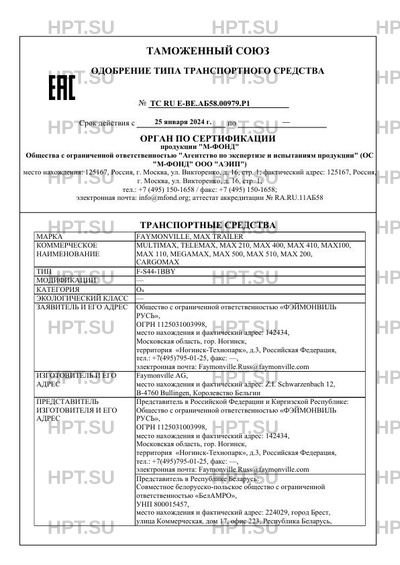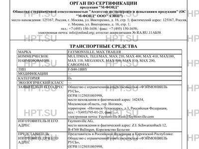 | Марка ТС | FAYMONVILLE, MAX TRAILER Коммерческое наименование FAYMONVILLE MULTIMAX, TELEMA… |