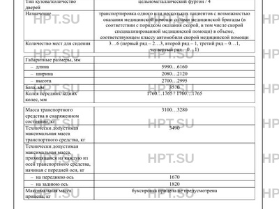 Оборудование ТС устройство вызова экстренных оперативных служб с автоматическим срабатыванием при опрокидывании; кондиционер (хладагент R134A); электроблокировка замков дверей; круиз-контроль; подушки безопасности; задний парктроник; аккумулятор; инвертор; предпусковой подогреватель двигателя; автономный отопитель; система кислородной разводки; дополнительный контур кондиционера; устройство приемное для тележки-каталки; зависимый жидкостный отопитель; тележка-каталка; СГУ (сигнально громкоговорящая установка); зарядное устройство; кресла врача; люк; стекла; подогрев топливного фильтра; фильтровентиляционная установка; бактерицидный рециркулятор; тепловентилятор; проблесковые маячки синего цвета; дополнительное освещение; мебель; ступенька; цветографическая оклейка; кислородный концентратор по заказу: тахограф; аппаратура спутниковой навигации; подножка