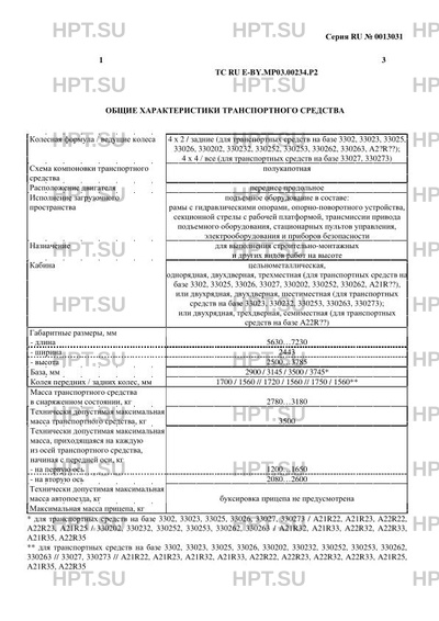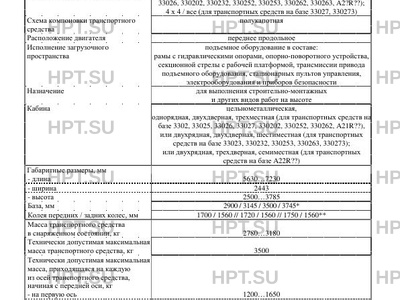 | Дополнительная информация | Транспортные средства не предназначены для перевозки пищевых продуктов и опасных грузов. Транспортные средства с колесной формулой 4 х 2 относятся к категории N1; с колесной формулой 4 х 4 — N1G. Коммерческое наименование автомобиль специальный «подъемник автомобильный гидравлический с рабочей платформой ВИПО-12-01» используется для транспортных средств типов ВИПО-12-01-3302, ВИПО-12-01-33025, ВИПО-12-01-33026, ВИПО-12-01-33023, ВИПО-12-01-33027, ВИПО-12-01-330273, ВИПО-12-01-330202, ВИПО-12-01-330252, ВИПО-12-01-330262, ВИПО-12-01-330232, ВИПО-12-01-330253, ВИПО-12-01-330263, ВИПО-12-01-А21R22, ВИПО-12-01-А21R32, ВИПО-12-01-А22R22, ВИПО-12-01-А22R32, ВИПО-12-01-А21R23, ВИПО-12-01-А21R33, ВИПО-12-01-А22R23, ВИПО-12-01-А22R33, ВИПО-12-01-А21R35, ВИПО-12-01-А21R25, ВИПО-12-01-А22R35; автомобиль специальный «подъемник автомобильный гидравлический с рабочей платформой ВИПО-17-01» — для ВИПО-17-01-3302, ВИПО-17-01-33025, ВИПО-17-01-33026, ВИПО-17-01-33027, ВИПО-17-01-330202, ВИПО-17-01-330252, ВИПО-17-01-330262, ВИПО-17-01-А21R22, ВИПО-17-01-А21R32, ВИПО-17-01-А21R23, ВИПО-17-01-А21R33, ВИПО-17-01-А21R35, ВИПО-17-01-А21R25. Для изготовления транспортных средств типов ВИПО-12-01-3302, ВИПО-17-01-3302 применяются модификации базовых транспортных средств и шасси 3302; для ВИПО-12-01-33025, ВИПО-17-01-33025 — 33025; для ВИПО-12-01-33026, ВИПО-17-01-33026 — 33026; для ВИПО-12-01-33023 — 33023; для ВИПО-12-01-33027, ВИПО-17-01-33027 — 33027; для ВИПО-12-01-330273 — 330273; для ВИПО-12-01-330202, ВИПО-17-01-330202 — 330202; для ВИПО-12-01-330252, ВИПО-17-01-330252 — 330252; для ВИПО-12-01-330262, ВИПО-17-01-330262 — 330262; для ВИПО-12-01-330232 — 330232; для ВИПО-12-01-330253 — 330253; для ВИПО-12-01-330263 — 330263; для ВИПО-12-01-А21R22, ВИПО-17-01-А21R22 — А21R22; для ВИПО-12-01-А21R32, ВИПО-17-01-А21R32 — А21R32; для ВИПО-12-01-А22R22 — А22R22; для ВИПО-12-01-А22R32 — А22R32; для ВИПО-12-01-А21R23, ВИПО-17-01-А21R23 — А21R23; для ВИПО-12-01-А21R33, ВИПО-17-01-А21R33 — А21R33; для ВИПО-12-01-А22R23 — А22R23; для ВИПО-12-01-А22R33 — А22R33; для ВИПО-12-01-А21R25, ВИПО-17-01-А21R25 — А21R25; для ВИПО-12-01-А21R35, ВИПО-17-01-А21R35 — А21R35; для ВИПО-12-01-А22R35 — А22R35. Показатели масс не могут превышать максимальных для конкретного базового транспортного средства или шасси, указанных в одобрении типа на базовое транспортное средство или шасси, на табличке изготовителя базового транспортного средства или шасси и в его сопроводительной документации. |