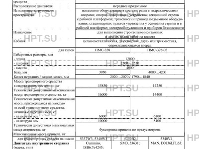 | Тип ТС | Для изготовления транспортных средств типа ПМС-328 применяется модификация шасси 5337W3; для ПМС-328-03 - 5340B2, 5340W3, 5340V4. Транспортные средства с двигателями ISB6.7e4245, 53631; относятся к экологическому классу 4; с двигателем D0836LFL63 - к экологическому классу 5. |