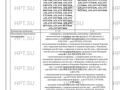 | Исполнение загрузочного пространства | лонжероны с поперечинами, консолями, с фитингами, металлическая платформа или без нее (все), без фитингов, с держателями-уловителями (уширителями) контейнера (только CST1235) - для CST1035, CST1235; металлическая платформа, с откидными боковыми и задним бортами или с передним высоким бортом и задними воротами, с боковыми стойками или без них, с каркасом и тентом или без них, с фитингами или без них или промтоварный фургон с задними и/или боковыми дверьми - для SWT1235, SWT1250; - металлическая платформа, с уширителями или без них, с откидными трапами или без них, с бортовой платформой в передней части полуприцепа или без нее, с боковыми стойками или без них, с открывающимися задним и боковыми бортами платформы или без них, с устройствами для крепления груза или без них; - для LBT1055, LBT1060, LBT1070, LBT1240, LBT1255, LBT1260, LBT1270; - самосвальный кузов прямоугольного или овального сечения, с задней разгрузкой - для DTT3228, DTT3236, DTT3240, DTT4036; - цистерна конусообразной формы - для CTT3235, CTT3639, CTT4044; - цистерна чемоданообразного или эллиптического сечения, некалиброванная, с термоизоляцией или без нее - для OTT3028, OTT3230, OTT3632, OTT4540, BTT3234, BTT3638, BTT4044 се), без фитингов, с держателями-уловителями (уширителями) контейнера (только CST1235) - для CST1035, CST1235; ми или без них, с каркасом и тентом или без них, с фитингами или без них или промтоварный фургон с задними и/или боковым или без нее, с боковыми стойками или без них, с открывающимися задним и боковыми бортами платформы или без них, с устр LBT1070, LBT1240, LBT1255, LBT1260, LBT1270; сечения, с задней разгрузкой - для DTT3228, DTT3236, DTT3240, DTT4036; ной формы - для CTT3235, CTT3639, CTT4044; ермоизоляцией или без нее - для OTT3028, OTT3230, OTT3632, OTT4540, BTT3234, BTT3638, BTT4044 |