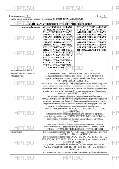 | Назначение | перевозка контейнеров типа 1C, 1CC, 1CX и контейнеров-цистерн типа T4, T11, T14 - для CST1035; - перевозка контейнеров типа 1ААА, 1АА, 1A, 1AX, 1BBB, 1BB, 1B, 1BX, 1CC, 1C, 1CХ, 1EEE, 1EE, в т.ч. контейнеровоз терминальный - для CST1235; - перевозка грузов общего назначения и контейнеров типа 1ААА, 1АА, 1A, 1AX, 1BBB, 1BB, 1B, 1BX, 1CC, 1C, 1CХ - для SWT1235, SWT1250; перевозка колесно-гусеничной техники и других крупногабаритных 1CX и контейнеров-цистерн типа T4, T11, T14 - для CST1035; 1B, 1BX, 1CC, 1C, 1CХ, 1EEE, 1EE, в т.ч. контейнеровоз терминальный - для CST1235; ААА, 1АА, 1A, 1AX, 1BBB, 1BB, 1B, 1BX, 1CC, 1C, 1CХ - для SWT1235, SWT1250; делимых грузов - для LBT1055, LBT1060, LBT1070, LBT1240, LBT1255, LBT1260, LBT1270; в - для DTT3228, DTT3236, DTT3240, DTT4036; рального порошка - для CTT3235, CTT3639, CTT4044; ов (опасный груз класса 3 по ДОПОГ) - для OTT3028, OTT3230, OTT3632, OTT4540; стоянии (опасный груз класса 9 по ДОПОГ) - для BTT3234, BTT3638, BTT4044 неделимых грузов - для LBT1055, LBT1060, LBT1070, LBT1240, LBT1255, LBT1260, LBT1270; - перевозка сыпучих грузов - для DTT3228, DTT3236, DTT3240, DTT4036; - перевозка цемента, песка, минерального порошка - для CTT3235, CTT3639, CTT4044; перевозка и кратковременное хранение светлых нефтепродуктов (опасный груз класса 3 по ДОПОГ) - для OTT3028, OTT3230, OTT3632, OTT4540; - перевозка битума в горячем (до +200°С) и холодном состоянии (опасный груз класса 9 по ДОПОГ) - для BTT3234, BTT3638, BTT4044 |