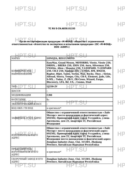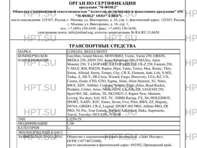 | Коммерческое наименование | EasyMax, Grand Mexon, MOTORRO, Vieste, Vieste 250, ORION, ; BRERA 250, ZION 250, Aura, Silvermax 250, VMAXie, Alien ; Monster 250, T-LEOPARD, T-LEOPARD 250, CR-Z 250, Fantom 250, ; V-MAX, RM, RM250, Raptor, Hijet, Tanto, Terios, Max, Rocky, Thor, ; Sirion, Allroad, Sierra, Tempo, City, CR-X, Element, Jade, Life, S-MX, ; Today, Z, ZR-V, ZR-Cross, Wizard, Fargo, Discovery, LFA, RZ, UX, ; Cosmo, Etude, FTO, GTO, Sigma, Alien, Alien Monster, X1, Nitro, ; BWX, XDV, Nibbler, Cyclone, Venom, Tiger, Atlas, Road Rocket, ; Predator, Critter, Arios, Nibbi, ADV, LX, GX, ZR, LEGEND 250, ; Sport 003, SK, Athlete, TE, SK250GY-5, Raptor New, Monster, ; Levorg, Six days, SAI, IST, TC, NIBBI Racing, FX, X6, HOLESHOT, ; SPORT, XADV, RTF, Xmax, Seven, Five, Pilot, BWS, ZZ, Majesty, ; DYNA, GRIDO, CR-Z, Legend, SPORT 003 PRO, Athlete PRO, ZR ; PRO, TE Pro, Tour Endure, Norden, Adventure, Duke, Supermoto, ; Travel, Traveler, NEVADA, V BOB |