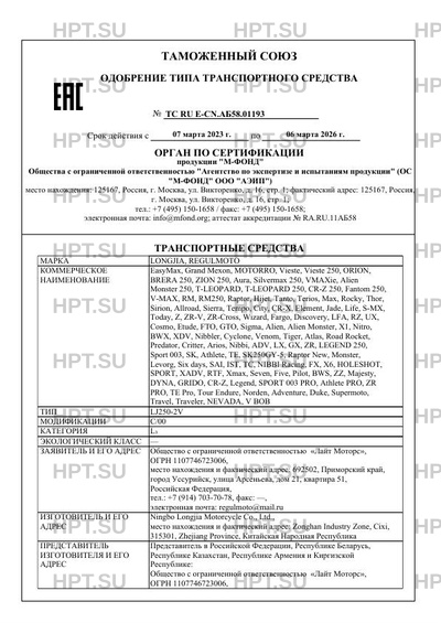 | Заявитель | Общество с ограниченной ответственностью «Лайт Моторс». место нахождения и фактический адрес: 692502, Приморский край, город Уссурийск, улица Арсеньева, дом 21, квартира 51, Российская Федерация. ОГРН: 1107746723006. Тел. +7 (914) 703-70-78. Факс -. Email regulmoto@mail.ru. |