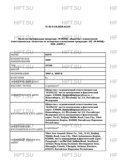 | Сборочный завод | Tibet New Summit Motor Co., Ltd., № 65, Beijing Middle Road, Lasa City, Tibet Autonomous Region, 850000, место нахождения и фактический адрес: Paragraph 1 on the 2nd, Jinhua Road, Southwest Airlines Hang Kong Economic Development Zone, Shuangliu County, Chengdu, Sichuan Province, 610225, Китайская Народная Республика |