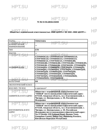 | Представитель изготовителя | Представитель в Российской Федерации, Республике Беларусь, Республике Казахстан, Республике Армения и Киргизской Республике: Общество с ограниченной ответственностью "ТОНЬЯ", ОГРН 1242800001542, место нахождения и фактический адрес: 675520, Амурская область, м.о. Благовещенский, с. Чигири, ул. Центральная, д. 39 Российская Федерация, тел.: +7(914)616-22-90, факс: -, электронная почта: tongya@mail.ru |