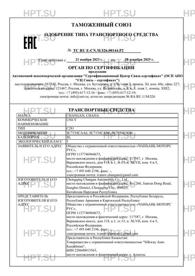 | Предприятие-изготовитель | Chongqing Changan Automobile Co., Ltd., место нахождения и фактический адрес: No. 260, Jianxin Dong Road, Jiangbei District, Chongqing City, 400023, Китайская Народная Республика |