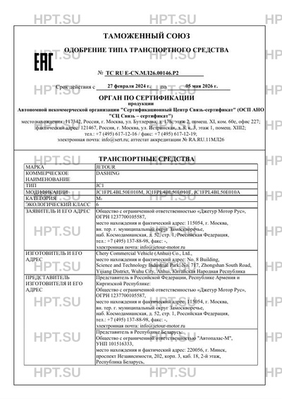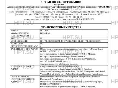 | Заявитель | Общество с ограниченной ответственностью "Джетур Мотор Рус", ОГРН 1237700105587, место нахождения и фактический адрес: 115054, г. Москва, вн. тер. г. муниципальный округ Замоскворечье, наб. Космодамианская, д. 52, стр. 1, Российская Федерация, тел.: +7 (495) 137-88-98, факс: -, электронная почта: info@jetour-motor.ru |