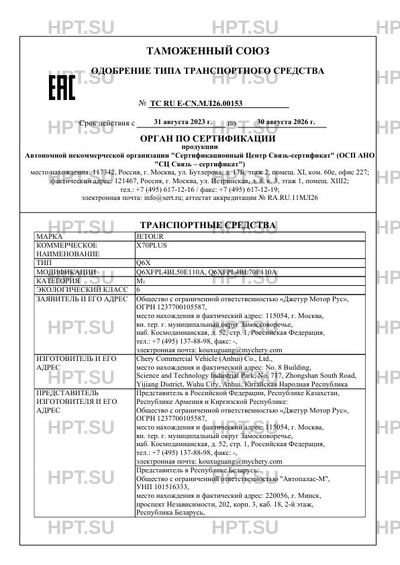 | Предприятие-изготовитель | Chery Commercial Vehicle (Anhui) Co., Ltd., место нахождения и фактический адрес: No. 8 Building, Science and Technology Industrial Park, No. 717, Zhongshan South Road, Yijiang District, Wuhu City, Anhui, Китайская Народная Республика |