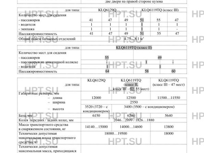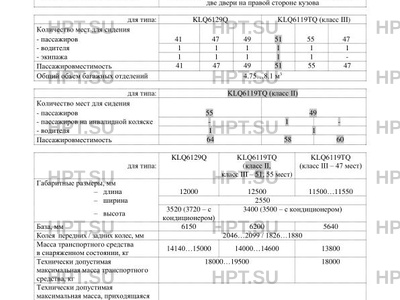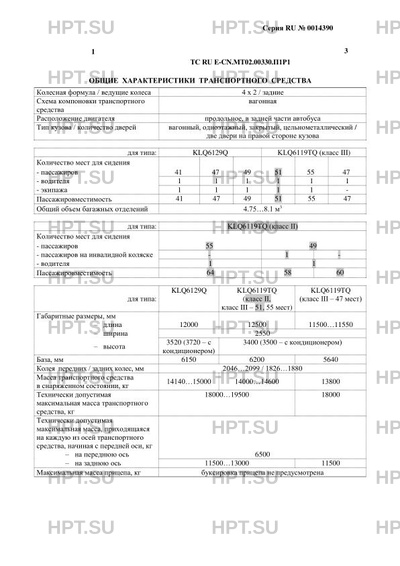 | Тип ТС | Транспортные средства KLQ6119TQ (с возможностью перевозки стоящих пассажиров) относятся к классу II, предназначенные для перевозки преимущественно сидящих пассажиров и имеющие возможность для перевозки стоящих пассажиров в проходе и (или) на площади, не превышающей площадь двойного пассажирского сидения, транспортные средства KLQ6119TQ (без возможности перевозки стоящих пассажиров), KLQ6129Q относятся к классу III, предназначены для перевозки исключительно сидящих пассажиров (абзац пятый пункта 2.2 приложения № 1 к техническому регламенту Таможенного союза "О безопасности колесных транспортных средств"). В случае несоответствия параметров транспортных средств значениям, установленным в пунктах 2.1, 2.2 приложения № 5 к техническому регламенту Таможенного союза “О безопасности колесных транспортных средств”, для передвижения транспортных средств по территории государств - членов Таможенного союза необходимо оформление специального разрешения. Мощность, измеренная без установленного на двигатель дополнительного оборудования (“брутто”), составляет: для двигателя Cummins, ISL9.5-385Е51А (ISL9.5Е5-385) – 282 (1900) кВт (мин-1), для двигателя Weichai, WP10.375E53 – 276 (1900) кВт (мин-1), для двигателя Weichai, WP10.336E53 – 247 (1900) кВт (мин-1). |