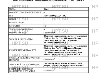 | Заявитель | Общество с ограниченной ответственностью "Хайгер Бас Рус". 141431, город Москва, улица Комсомольская, 5, строение 2, Российская Федерация. ОГРН: 5087746034052. Тел. +7-495-665-67-45. Факс +7-495-665-67-45. Email 1001656@rbauto.ru. |