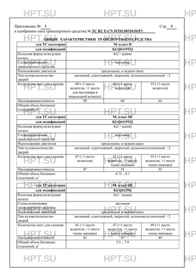 | Тип ТС | В случае несоответствия параметров транспортных средств значениям, установленным в пунктах 2.1, 2.2 приложения № 5 к техническому регламенту Таможенного союза “О безопасности колесных транспортных средств”, для передвижения транспортных средств по территории государств - членов Таможенного союза необходимо оформление специального разрешения. Все модификации транспортных средств оснащены ремнями безопасности на всех сиденьях и могут быть использованы для перевозки пассажиров в междугородном сообщении. Мощность, измеренная без установленного на двигатель дополнительного оборудования (“брутто”), составляет: для двигателя Dongfeng Cummins, ISL9.5-385Е51А (ISL9.5Е5-385) – 282 (1900) кВт (об/мин), для двигателя Weichai, WP10.375E53 – 276 (1900) кВт (об/мин), для двигателя Weichai, WP10.336E53 – 247 (1900) кВт (об/мин). Модификации Категория KLQ6119ТQ M3 класс II KLQ6129Q, KLQ6119ТQ M3 класс III Транспортные средства относятся к классу II, предназначены для перевозки преимущественно сидящих пассажиров и имеют возможность для перевозки стоящих пассажиров в проходе и на площади, не превышающей площадь двойного пассажирского сидения (абзац пятый пункта 2.2 приложения № 1 к техническому регламенту Таможенного союза «О безопасности колесных транспортных средств») Транспортные средства относятся к классу III, предназначены для перевозки исключительно сидящих пассажиров (абзац пятый пункта 2.2 приложения № 1 к техническому регламенту Таможенного союза «О безопасности колесных транспортных средств») |