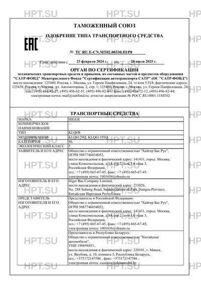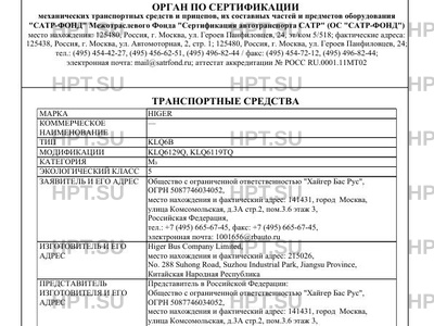 | Предприятие-изготовитель | Higer Bus Company Limited, место нахождения и фактический адрес: 215026, No. 288 Suhong Road, Suzhou Industrial Park, Jiangsu Province, Китайская Народная Республика |