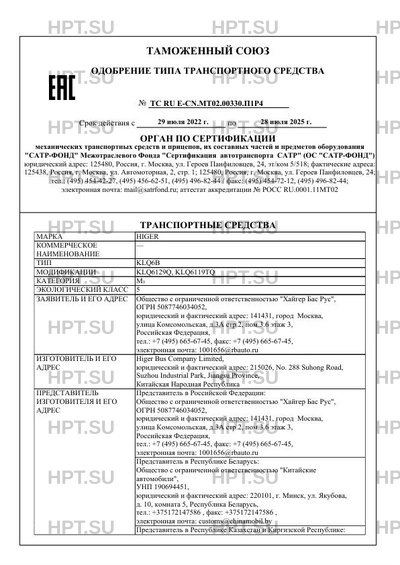 Представитель изготовителя Представитель в Российской Федерации: Общество с ограниченной ответственностью "Хайгер Бас Рус", ОГРН 5087746034052, место нахождения и фактический адрес: 141431, город Москва, улица Комсомольская, д.3А стр.2, пом.3.6 этаж 3, Российская Федерация, тел.: +7 (495) 665-67-45, факс: +7 (495) 665-67-45, электронная почта: 1001656@rbauto.ru Представитель в Республике Беларусь: Общество с ограниченной ответственностью "Китайские автомобили", УНП 190694451, место нахождения и фактический адрес: 220101, г. Минск, ул. Якубова, д. 10, комната 5, Республика Беларусь, тел.: +375172147586 , факс: +375172147586 , электронная почта: customs@chinamobil.by Представитель в Республике Казахстан и Киргизской Республике Товарищество с ограниченной ответственностью "МАИС", БИН 961040000050, место нахождения и фактический адрес: 141200, Павлодарская область, город Экибастуз, улица Алькея Маргулана, 14, Республика Казахстан, тел.: +77187751011, факс: +77187751011, электронная почта: TOO_MAIS@MAIL.RU Представитель в Республике Армения: Общество с ограниченной ответственностью "ТРАК", УНН 00171178, место нахождения и фактический адрес: 0051, г. Ереван, ул. Мамиконянц, 51/19, Республика Армения, тел.: +37494999555, факс: -, электронная почта: ruckarmenia@gmail.com