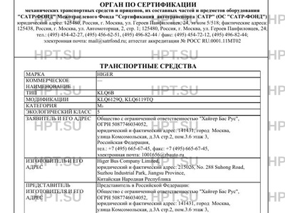 Предприятие-изготовитель Higer Bus Company Limited, юридический и фактический адрес: 215026, No. 288 Suhong Road, Suzhou Industrial Park, Jiangsu Province, Китайская Народная Республика