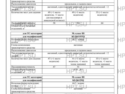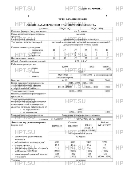 | Тип ТС | Транспортные средства являются автобусами класса III. В случае несоответствия параметров транспортных средств значениям, установленным в пунктах 2.1, 2.2 приложения № 5 к техническому регламенту Таможенного союза “О безопасности колесных транспортных средств”, для передвижения транспортных средств по территории государств - членов Таможенного союза необходимо оформление специального разрешения. Мощность, измеренная без установленного на двигатель дополнительного оборудования (“брутто”), составляет: для двигателя Cummins, ISD300 50 – 221 (2500) кВт (мин-1), для двигателя Cummins, ISL340 50 – 250 (2100) кВт (мин-1), для двигателя Cummins, ISL9.5-385Е51А (ISL9.5Е5-385) – 282 (1900) кВт (мин-1), для двигателя Weichai, WP10.375E53 – 276 (1900) кВт (мин-1). |