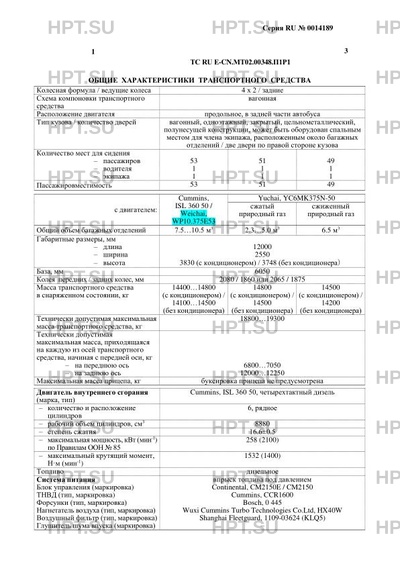 | Дополнительная информация | Транспортные средства относятся к классу III и предназначены для перевозки исключительно сидящих пассажиров (абзац пятый пункта 2.2 приложения № 1 к техническому регламенту Таможенного союза «О безопасности колесных транспортных средств»). В случае несоответствия параметров транспортных средств значениям, установленным в п.п. 2.1 и 2.2 приложения № 5 к техническому регламенту Таможенного союза «О безопасности колесных транспортных средств», для передвижения транспортных средств по территории государств — членов Таможенного союза необходимо оформление специального разрешения. Мощность, измеренная без установленного на двигатель дополнительного оборудования (“брутто”), составляет: для двигателя Cummins, ISL 360 50 – 265 (2100) кВт (мин-1), для двигателя Yuchai, YC6MK375N-50 – 276 (2100) кВт (мин-1). |