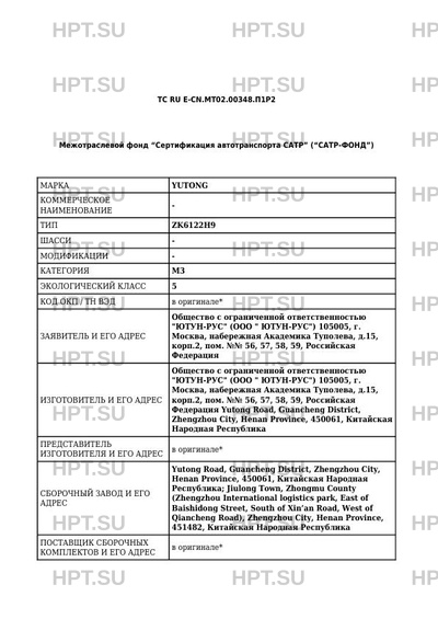| Предприятие-изготовитель | Zhengzhou Yutong Bus Co., Ltd. Yutong Road, Guancheng District, Zhengzhou City, Henan Province, 450061, Китайская Народная Республика. |