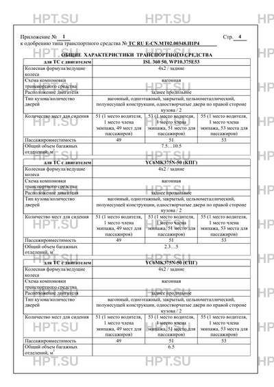 | Оборудование ТС | электронная система контроля устойчивости (ESC); устройство ограничения максимальной скорости; спутниковая система навигации ГЛОНАСС; устройство вызова экстренных оперативных служб по заказу: холодильник; кондиционер (хладагент R134a); аудио-видео подготовка; телевизор; аудио-видео оборудование; охладитель питьевой воды; спальное место, расположенное около багажных отделений; туалет; автономный отопитель |