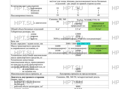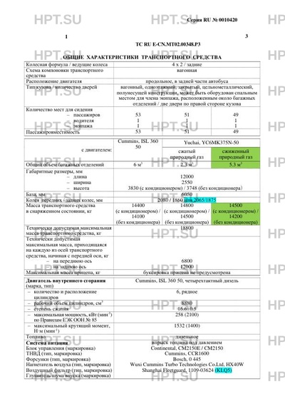 | Дополнительная информация | Транспортные средства являются автобусами класса III. В случае несоответствия параметров транспортных средств значениям, установленным в п.п. 2.1 и 2.2 приложения № 5 к техническому регламенту Таможенного союза «О безопасности колесных транспортных средств», для передвижения транспортных средств по территории государств — членов Таможенного союза необходимо оформление специального разрешения. Мощность двигателя Cummins, ISL 360 50, измеренная без установленного на двигатель дополнительного оборудования (“брутто”), составляет 265 (2100) кВт (мин-1). Мощность двигателя Yuchai, YC6MK375N-50, измеренная без установленного на двигатель дополнительного оборудования (“брутто”), составляет 276 (2100) кВт (мин-1). |