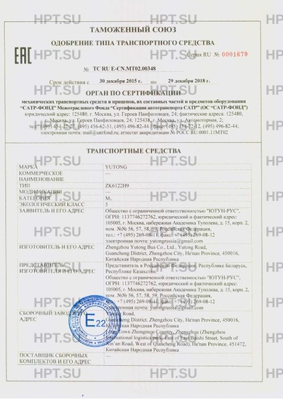| Предприятие-изготовитель | Zhengzhou Yutong Bus Co., Ltd., Yutong Road, Guancheng District, Zhengzhou City, He nan Province, 450016, Китайская Народная Республика |