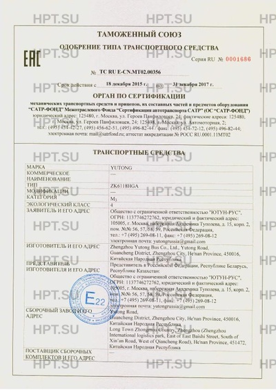 | Предприятие-изготовитель | Zhengzhou Yutong Bus Co., Ltd., Yutong Road, Guancheng District, Zhengzhou City, He nan Province, 450016, Китайская Народная Республика |